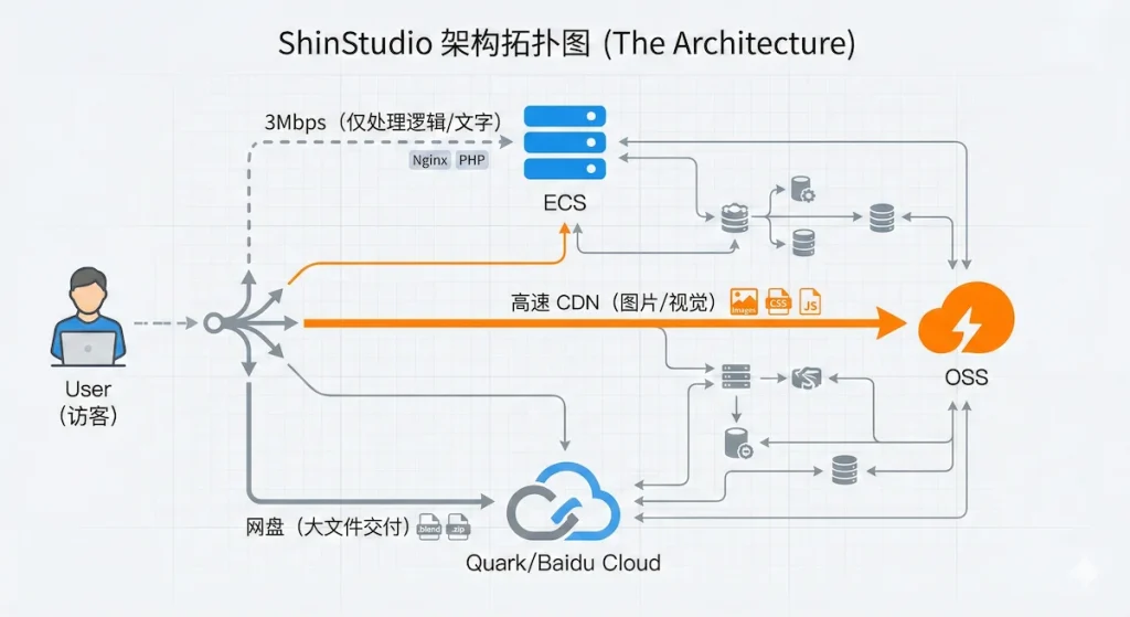 在上一篇《成立宣言》中,我提到 ShinStudio 是我逃离算法推荐、在数字世界建立的一块“精神飞地”。但要让这块飞地真正从概念落地为现实,首先要解决的是 “土地”(服务器)和 “物流”(带宽)的问题。